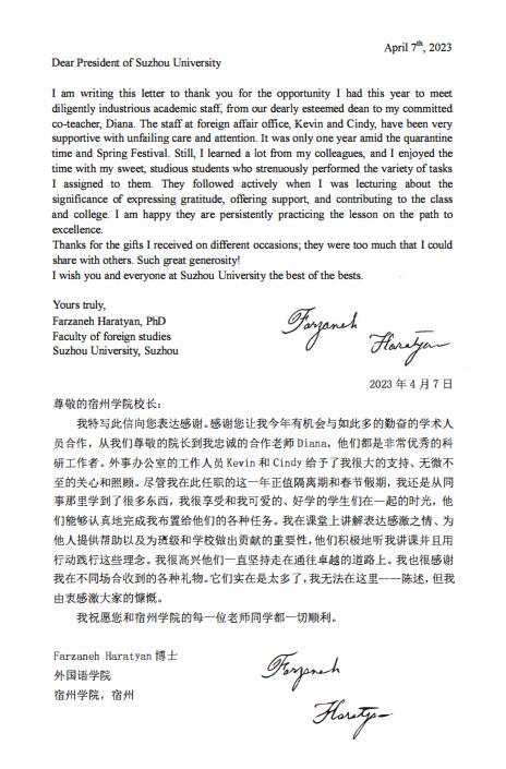 Farzaneh Haratyan博士在我校外国语学院任教以来,承担英美文学方向的教学任务和科研团队的科研任务,她治学严谨,教学方法灵活,深受学生喜爱。同时,她建立了科研小组,帮助指导同事进行科研论文写作,积极参加国内国际会议。她非常热爱中国,喜欢中国的传统文化,与同事相处融洽。她性格活泼热情,热爱旅行,经常向远在伊朗的家人朋友分享她在宿州的生活。如今,在她任教期满即将离开中国之际,她特意致信宿州学院校长,向宿州学院表达感谢,感谢领导和同事的关心与合作以及各种愉快的、难忘的工作经历和生活体验,并祝愿大家一切顺利。