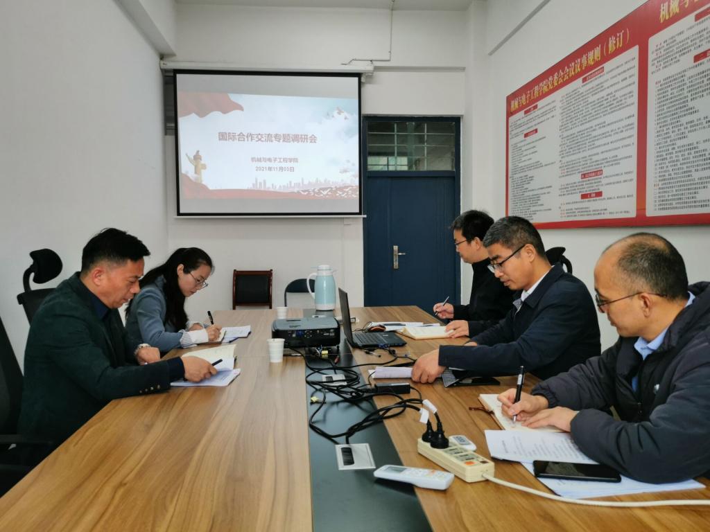 为进一步推动党史学习教育“我为师生办实事”相关活动,11月3日上午,国际交流与合作处副处长(临时负责)安晓斌一行赴机械与电子工程学院开展国际交流合作专题调研,机电学院党委书记杨杰,党委副书记、院长朱光,科研副院长刘从虎参加此次调研会。