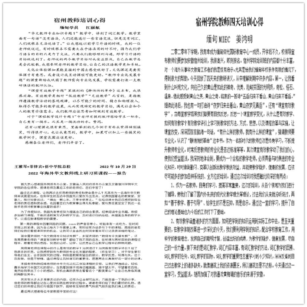 在撰写的心得体会中,不少学员对本次研习班予以高度评价。来自菲律宾的王雅琴写道:“在培训课中我深深感受到每位老师的责任感和使命感,也因着您们为教育事业的无私奉献、爱与责任更坚定了我这一名新手老师对教育事业执著的追求!”缅甸学员姜鸿明说:“宿州学院培训班的内容十分丰富,对一个在海外从事华文教育工作的我极有启示。尤其是对我们缅甸条件有限的华校,有很大的帮助。”通过撰写心得体会,学员们巩固了第一阶段的学习成果,也对后面的培训充满了希望,同时还提出了一些合理的建议。