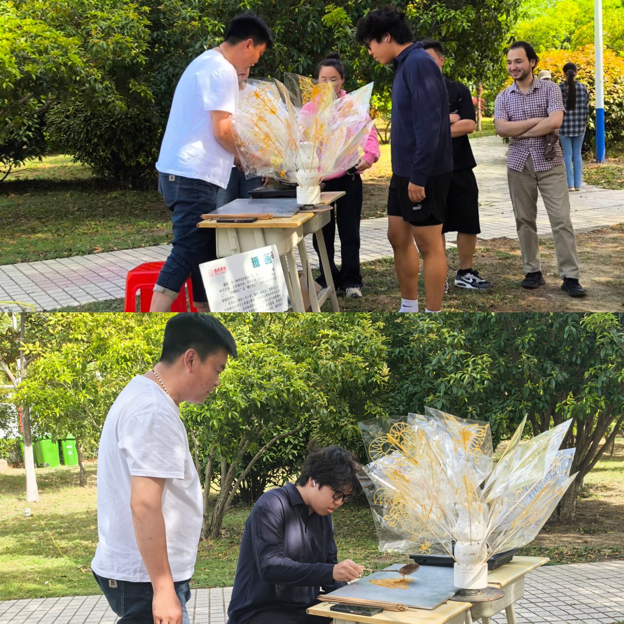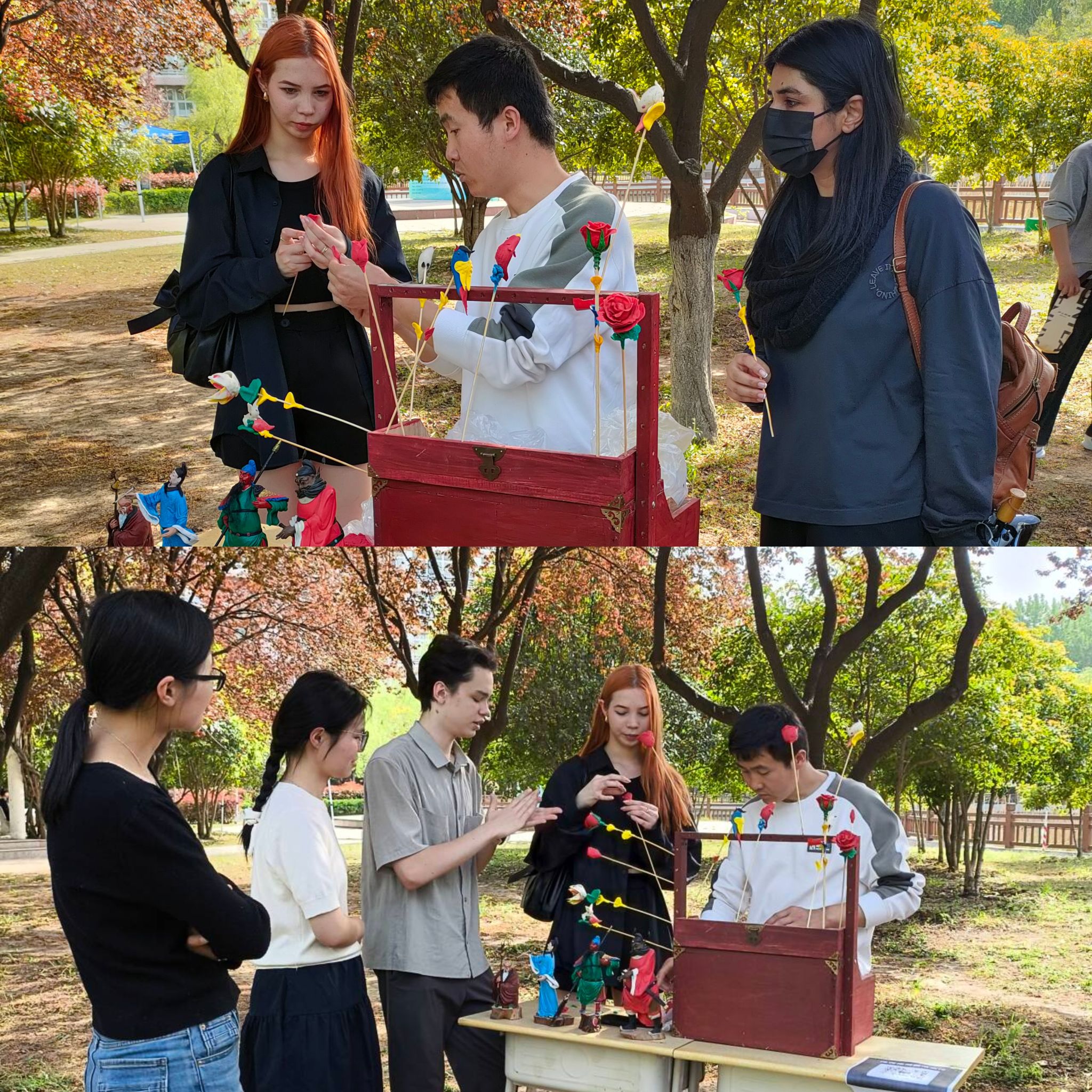在民俗文化展示区,外籍师生向糖画、捏面人、花鸟字、剪纸等传统手工艺人们请教制作方法,并亲身体验了捏面人、糖画制作和创意剪纸。文创集市深受外籍师生欢迎,色彩丰富的漆扇、古风古韵的书签、玲珑剔透的手串、花色各异的簪子……琳琅满目的文创作品引得他们驻足欣赏。民俗文化美食区飘香四溢,展架上摆满了符离集烧鸡、栏杆牛肉、手工面皮等宿州本地美食,外籍师生品尝后不断点头称赞。