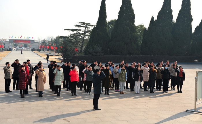 在淮海战役双堆集烈士纪念碑前,同志们驻足瞻仰,默哀致敬,在党委组织部副部长张劲松的带领下,面对鲜红党旗,庄严举起右拳,重温入党誓词,向党宣誓,再次提醒自己要时刻牢记党员身份,不忘初心、牢记使命。